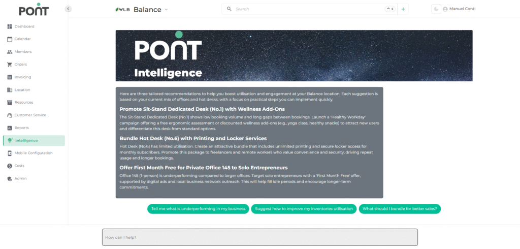 The Intelligence Module is your AI-powered decision support tool, designed to optimize space utilization, boost sales, and increase engagement in your coworking or flexible workspace.