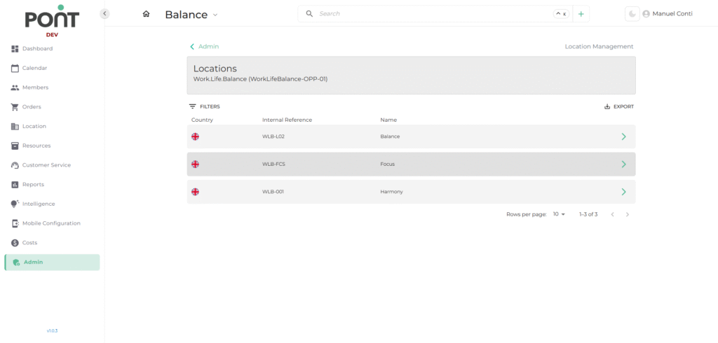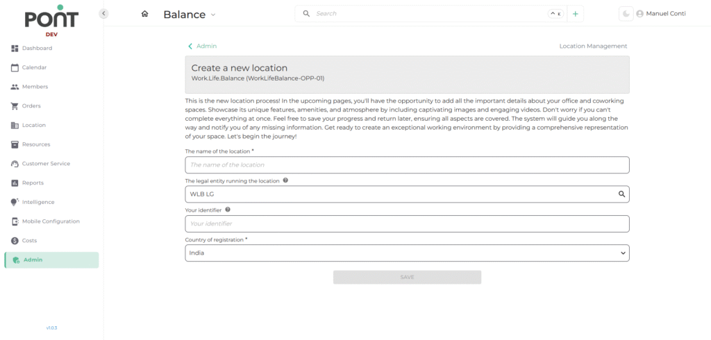 The Location Management section under the Admin module provides a centralized way to manage all physical workspace locations. It allows administrators to create, view, and edit location details, ensuring each site is set up with complete operational and marketing information.